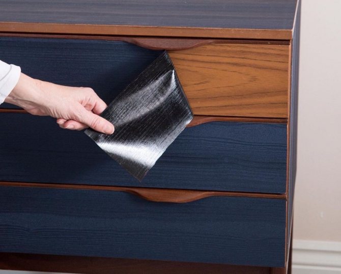 Conseils! Choisissez un film en tenant compte de la surface sur laquelle vous prévoyez de le coller. Par exemple, lors de la rénovation de meubles anciens, une couche transparente est mieux adaptée pour aider à éliminer les éraflures et les rayures mineures sans ajuster la couleur et la texture du bois. Un film avec des motifs en mosaïque a fière allure sur du verre.