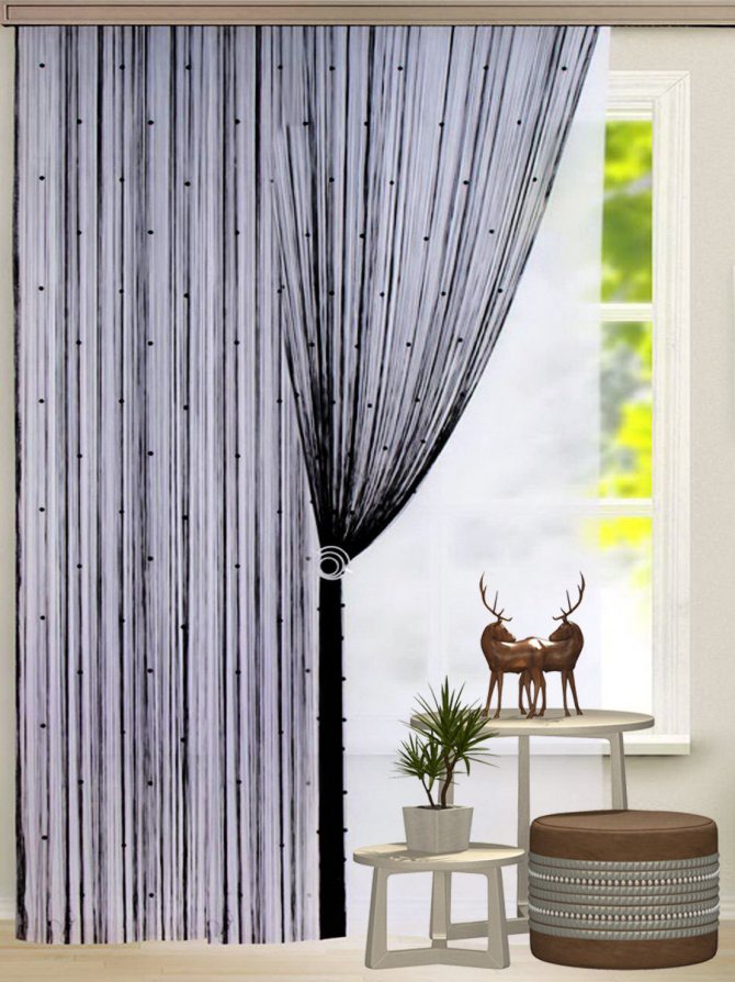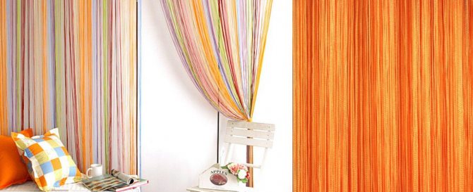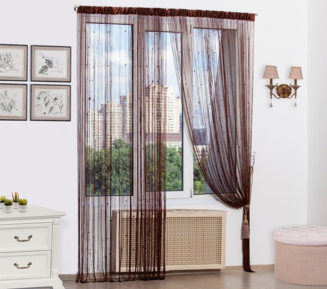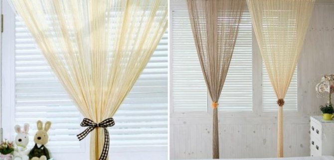 L'idée d'accrocher des rideaux de filaments pour la décoration de la maison appartient aux habitants des pays de l'Est. Cela est dû à la logique habituelle - dans la chaleur, de tels rideaux protégeront du soleil et l'air s'écoulera dans la maison. Il existe un mythe selon lequel les rideaux de filaments créent une ombre faible. Cependant, ce n'est pas le cas, sinon dans les pays au climat où règnent des températures élevées, ils ne seraient tout simplement pas accrochés. Les fils s'emboîtent assez étroitement les uns aux autres, tout en restant libres.