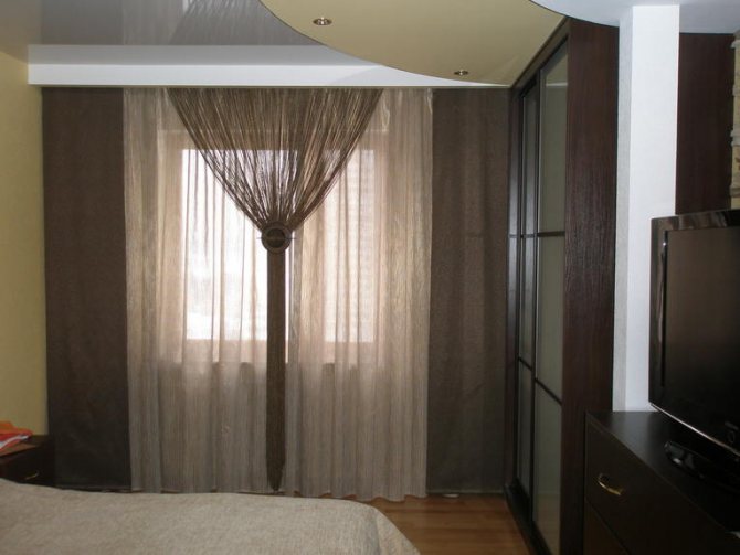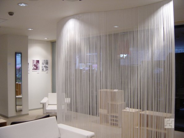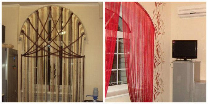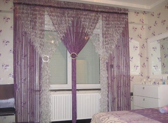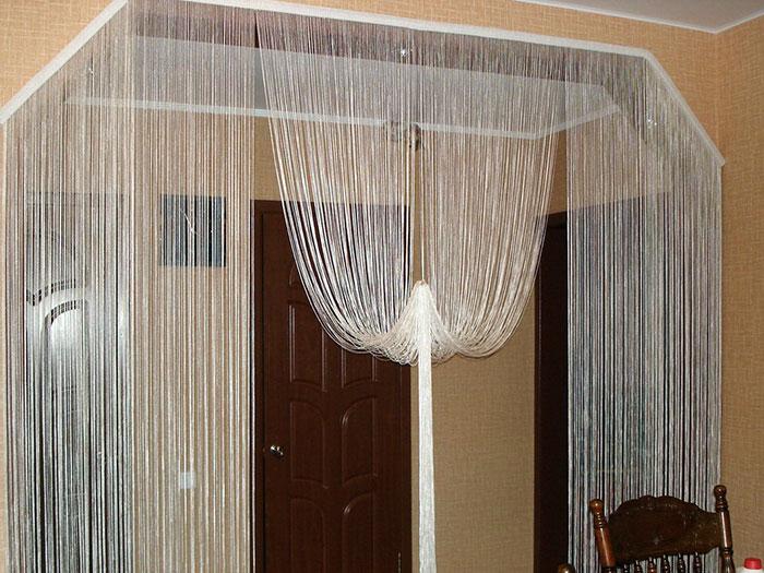 En même temps, avec un rideau fait de fils, c'est en quelque sorte plus confortable, il y a une sensation d'atmosphère intime et intime. Dans le même temps, la pièce n'est pas grossièrement divisée en deux ou en zones, comme cela pourrait être le cas lors de l'installation d'une cloison monolithique.