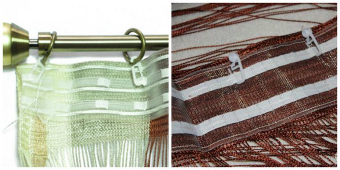 La façon la plus simple de nouer des rideaux est d'utiliser des crochets. Ils sont situés sur un fil solide dans une rangée. Après cela, des crochets sont cousus au tissu.