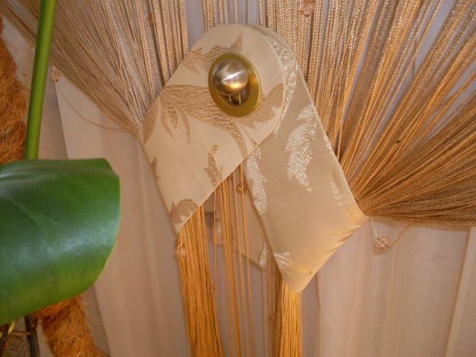 Ces rideaux ne sont pas fabriqués à partir de tous les fils, mais uniquement à partir d'un fil élastique solide qui ne s'étire pas sous le poids des perles. Ce décor est facile à faire de vos propres mains, et c'est un autre avantage. Ils se fixent directement à la corniche sous la forme d'une boucle à deux extrémités libres.