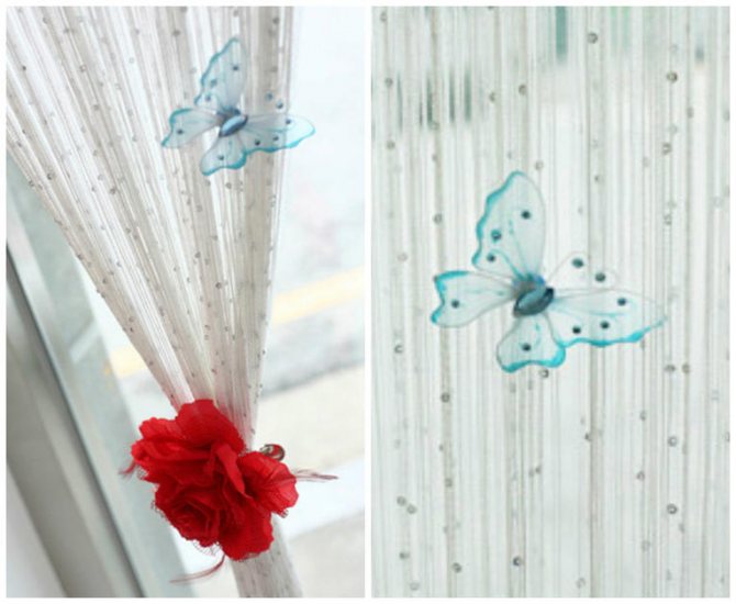 La base de tels rideaux peut être du fil ou des brins de fils lisses. Vous, en tant que maître, pouvez décorer le rideau à votre guise : perles, petits jouets, franges, cloches ou encore papillons artificiels. Si vous préparez du fil comme matériau pour les futurs rideaux, ils seront beaucoup plus lourds et en apparence plus robustes et plus solides. Si vous choisissez des fils lisses, le produit sera plus léger, plus doux, comme s'il coulait. La base peut également être une ligne de pêche tissée, décorée de perles ou de perles.