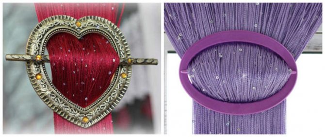 Les rideaux en filament à l'intérieur peuvent soit pendre librement au sol ou au rebord de la fenêtre, selon la longueur, soit être joliment noués. Il a l'air élégant et créatif, ce qui permet à de tels rideaux de devenir un véritable point fort de tout l'intérieur. Souvent, le fil textile est ramassé avec un ruban ou une structure solide spéciale au centre ou sur le côté. Ceci est considéré comme une décoration classique. Les fils peuvent également être clivés ensemble en prenant un crochet spécial pour cela, qui ressemble en apparence à une pince à cheveux. Vous pouvez le choisir pour correspondre à la teinte des rideaux ou choisir la couleur opposée.
