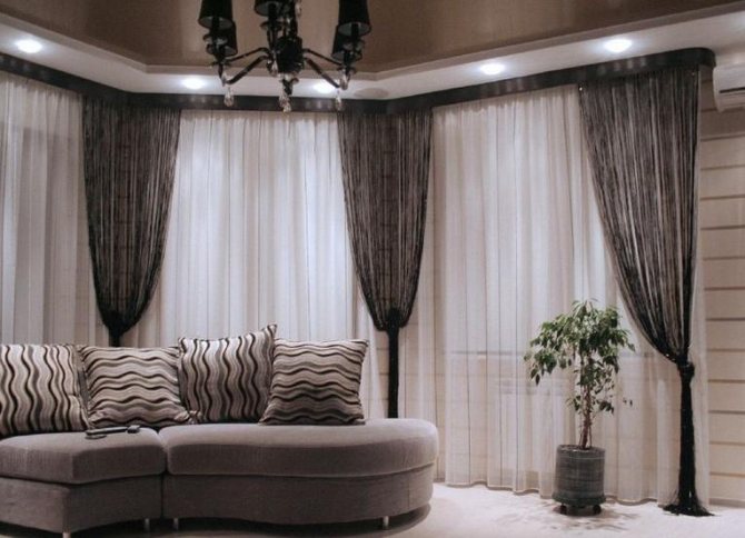 Mais vous pouvez choisir à votre guise, en fonction du style que vous avez choisi. Le produit est monté au plafond. L'avantage de ce type de tringle à rideaux est qu'elle donne l'impression que les rideaux sont fixés directement au plafond. La raison en est que la partie visible de la structure coïncide pratiquement avec le plan du plafond.