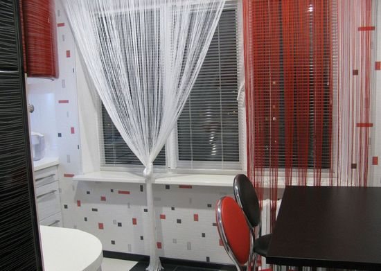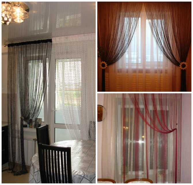 - vous pouvez passer à travers les rideaux de fil sans même les écarter, il est donc pratique de les utiliser pour décorer l'ouverture de la fenêtre, combinée à la sortie sur le balcon, présente dans presque toutes les cuisines;