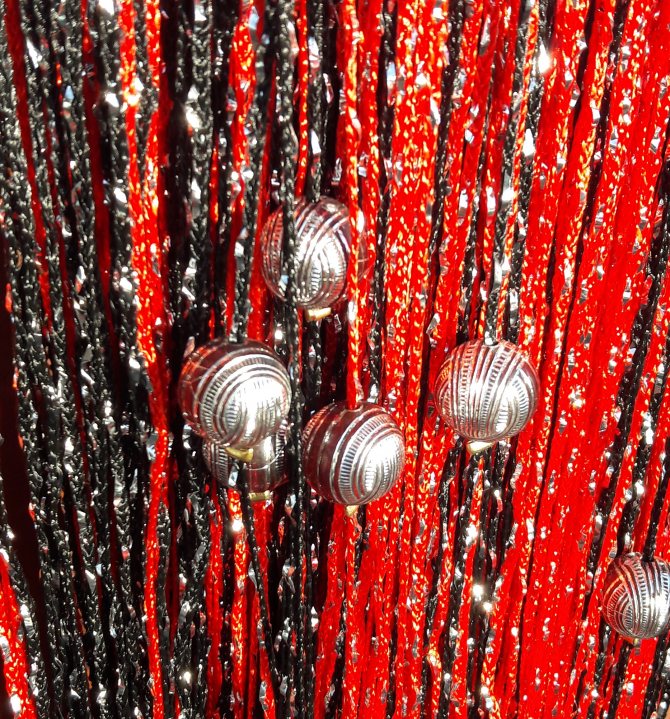 Beaucoup ont de grosses perles, des barres de bois plates (ou de quoi les fabriquer), des clairons, des perles, des plumes colorées. Pompons, fleurs artificielles et papillons en plastique sont faciles à fabriquer soi-même. La base doit être solide et résistante à l'étirement. Les fragments lourds sont placés plus près de la corniche, les plus légers - en bas. Un poids peut être cousu le long du bord pour que le rideau se balance moins au vent. Des perles, des noix entrelacées de fil, de beaux boutons ou des glands cousus à partir de morceaux de franges roulés en rouleau feront l'affaire.