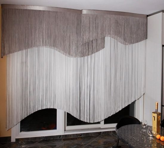 Bien que la cuisine de la maison soit l'endroit le plus sensible à la pollution, vous pouvez également y accrocher des rideaux de corde. L'essentiel est de choisir un matériau qui protège contre la saleté de la cuisine. De telles opportunités existent actuellement dans le développement de l'industrie textile.