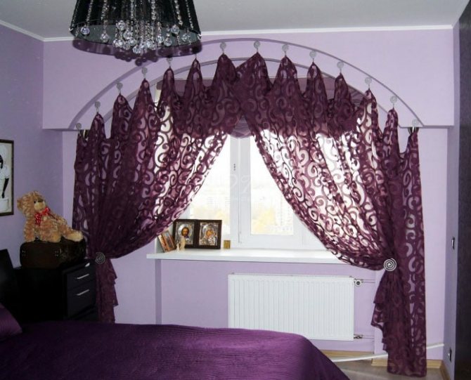 - Il est permis d'utiliser des arcs comme base pour la fixation ultérieure des rideaux. Vous devez accrocher le tissu de manière à ce que la forme arquée ne soit pas cachée. Si nous parlons de la cuisine, il est préférable d'utiliser une tringle à rideau en plastique ou en aluminium.