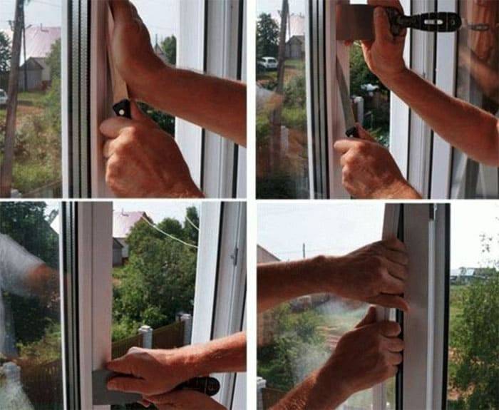 Pour ce faire, il est nécessaire de retirer la barre supérieure de la structure. Il est fortement déconseillé à une personne inexpérimentée de ne pas permettre un démontage complet du cadre, car dans ce cas, la tension du treillis sera violée et il sera assez difficile de la réparer. Afin de retirer la pièce, il est nécessaire de soulever soigneusement le cordon d'étanchéité avec un tournevis fin, ce qui tire la protection de ce côté.