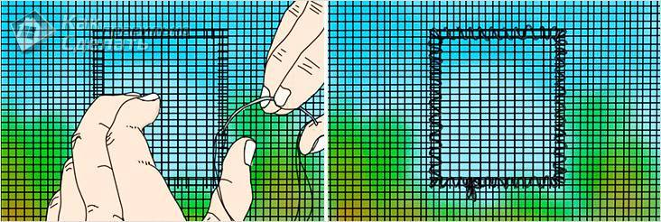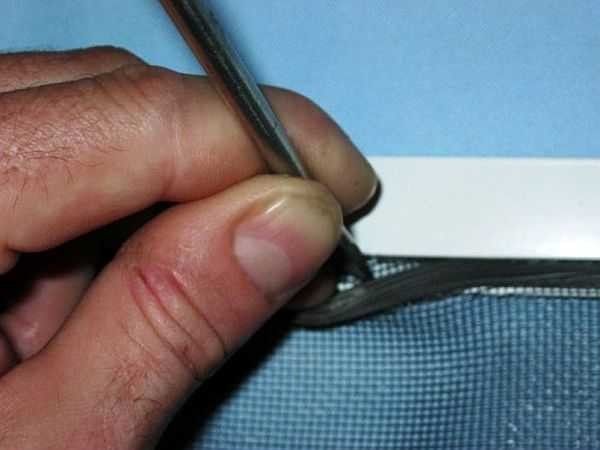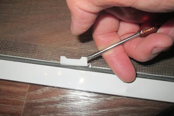 Après cela, sans mouvements brusques, le cordon est retiré de la rainure du cadre, suivi du maillage lui-même. Après cela, vous devez retirer soigneusement le coin cassé. S'il ne cède pas, il peut être enfoncé plus profondément dans la cavité du cadre à l'aide d'un tournevis.