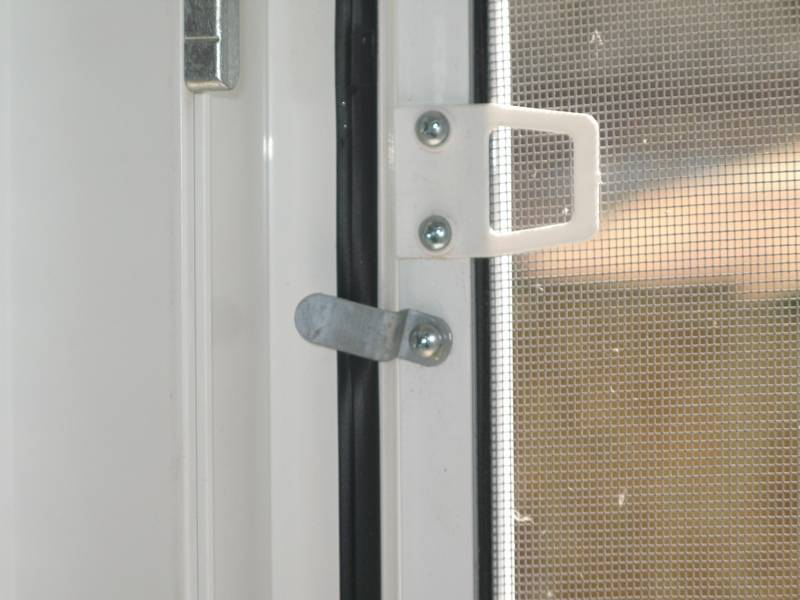 Accrocher un moustique sur des drapeaux est simple: fixez les éléments sur le cadre de la fenêtre - 2 en haut et deux en bas. Si des vents forts soufflent dans votre région, cochez 6 cases pour votre sécurité. Positionnez-les de manière à ce que lorsque vous tournez la plaque, ils appuient fermement le treillis contre la fenêtre. Une vis autotaraudeuse sert d'axe de pivotement pour la plaque.