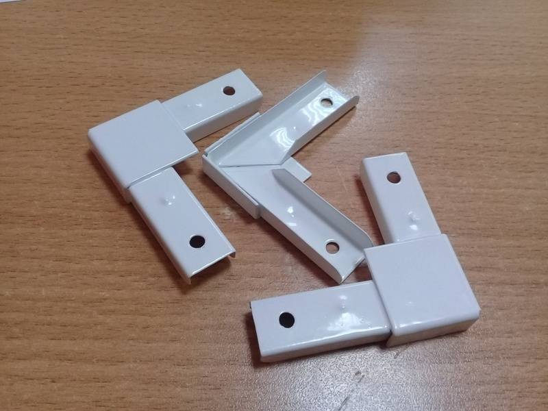 Pour un nouveau coin, vous pouvez utiliser un morceau de feuille de plastique, il est conseillé de le sélectionner en blanc, ou dans une teinte telle qu'il ne se détache pas beaucoup sur le fond du cadre blanc. Nous mesurons les dimensions du profil, en tenant compte de celles-ci, vous devez marquer la pièce. La forme requise est donnée à l'aide d'une scie à métaux en métal avec une lame mince et de petites dents, ou vous pouvez utiliser une scie sauteuse.