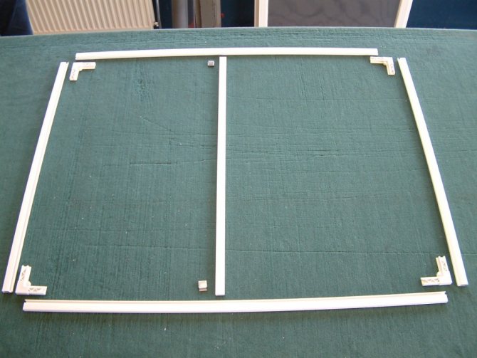 L'assemblage du cadre se fait en le martelant à partir de deux segments longs et deux courts à l'aide de coins. Les coins sont fermement insérés dans le profil principal; vous ne pouvez pas les insérer avec vos mains. Pour connecter les profils, vous avez besoin d'un marteau, mais frapper directement sur le cadre n'est pas recommandé (vous pouvez écraser le profil en plastique). Pour réaliser l'assemblage sans dommage, les coins sont martelés en plaçant un bloc de bois.