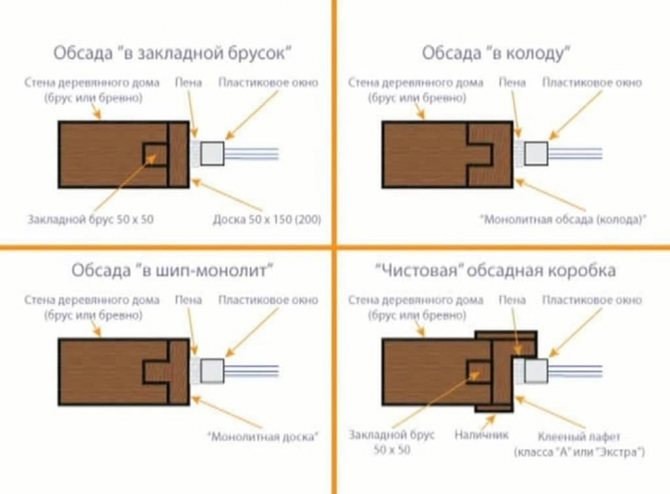 Semis de finition ou coupe "quart de taille". Il a une rainure sur le bord extérieur de la planche. Un cadre de fenêtre est placé dans ce contour. La fenêtre est au niveau du mur extérieur. Il n'a pas besoin d'être en plus taillé avec des pentes. Des éboulis sont placés sur les fenêtres et des moulures sont fixées pour protéger les joints de la pénétration d'humidité.