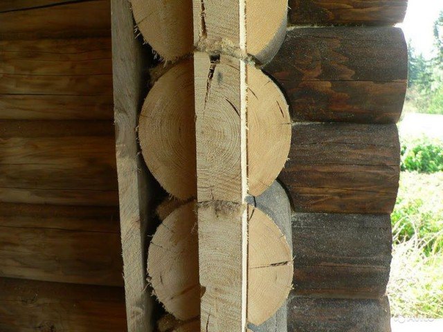 La connexion tient bien les charges, mais n'est pas toujours durable, car la connexion n'est pas monobloc. Les vis autotaraudeuses en métal réduisent la durée de vie de l'essaim et de toute la coupe.Si de l'humidité pénètre sous le boîtier, les vis peuvent rouiller. Les essaims dans une maison en rondins sont immédiatement placés sur l'isolant, vous pouvez leur attacher une fenêtre de finition. La déformation du bois est insignifiante.