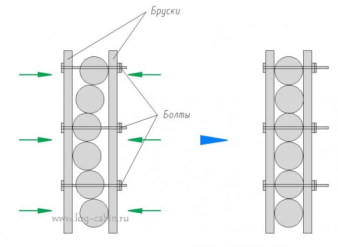Il convient de noter que dans la plupart des cas, la construction de cabanes en rondins est réalisée selon ce principe. La pression exercée par le poids des matériaux de construction est suffisante pour la stabilité de la structure. Les barres, cependant, doivent être fixées par la barre.