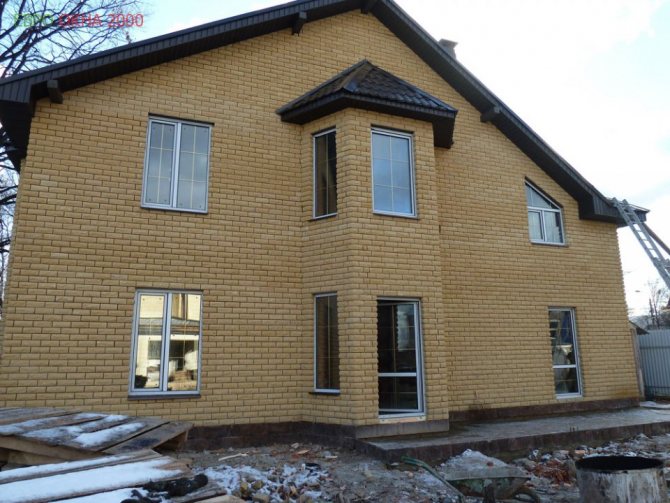 S'il y a des coups sur la façade, il est facile de conclure sur la disposition transversale des briques. L'épaisseur des murs dans une telle situation sera augmentée proportionnellement par rapport à l'emplacement précédent de 2 fois (240-260 mm).