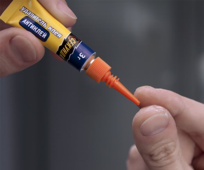 En cas de travail négligent, la colle instantanée peut non seulement pénétrer sur les surfaces à coller, mais également sur la peau des mains et des objets environnants. Dans la maison, les propriétaires prudents ont une solution spéciale pour éliminer les résidus de colle ("Antiklei"). Ce produit dissout efficacement la substance et est utilisé pour nettoyer une grande variété de surfaces. Il suffit de l'appliquer sur la zone à problème, d'attendre le temps imparti et d'essuyer les restes.