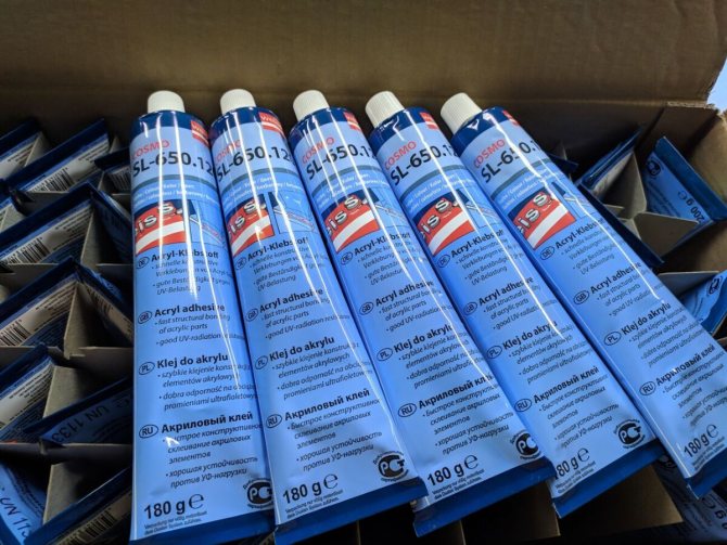 - Cosmo - 500.200 (deuxième cyanoacrylate). A une fixation instantanée. Convient à tous les matériaux courants. Après l'application, vous obtenez des coutures durables et résistantes à l'humidité qui ne craignent pas les changements de température et les produits chimiques agressifs.