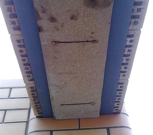 Pour le bandage du support et de la maçonnerie avant, un treillis de maçonnerie d'un maillage de 50x50 en fil de 3 mm d'épaisseur est utilisé. Les pilastres sont attachés à la maçonnerie de support à l'aide d'une large maille, qui est posée à intervalles dans 8 rangées de la maçonnerie avant. Toutes les 4 rangées de la maçonnerie avant, le pilastre est attaché uniquement avec le pilier avant.