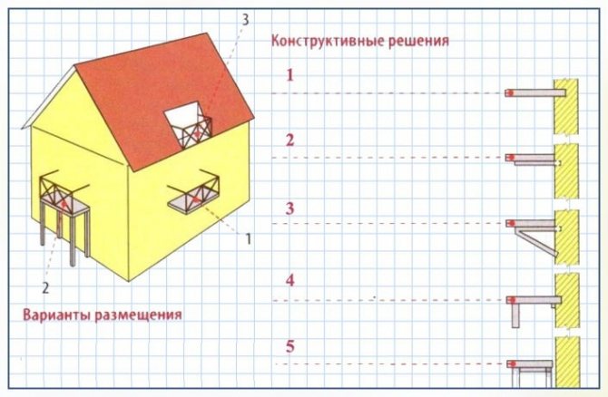 Après avoir décidé de la construction d'un balcon, il convient de bien considérer sa conception et son emplacement. Il peut s'agir d'un porte-à-faux (suspendu en l'air), d'un balcon attenant ou situé dans le grenier, reposant sur les murs de la maison (options 1, 2 et 3 sur la photo). Les solutions constructives diffèrent dans la manière de fixer les dalles de balcon: