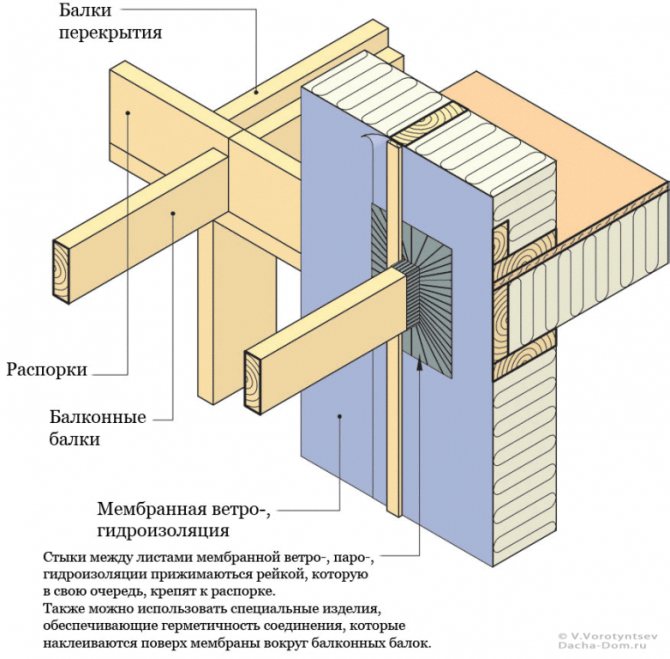 - Après cela, les poutres en porte-à-faux sont insérées dans les trous précédemment laissés avec un pas de 0,7 à 2 m, qui reposent sur les poutres longitudinales. L'arbre est traité avec des antiseptiques et les extrémités qui pénètrent dans le mur sont enveloppées dans un matériau de toiture.