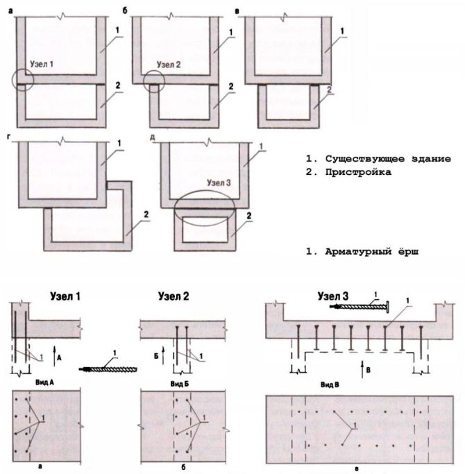 La fondation plus légère adjacente au bâtiment principal ne peut pas être reliée «étroitement», mais uniquement à l'aide d'un joint de dilatation. Sinon, avec un rétrécissement inévitable, l'une des fondations sera inévitablement détruite.