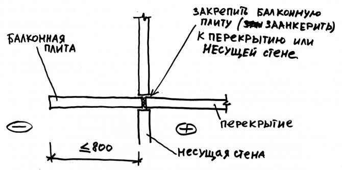 Il semble que la zone de support dans ce cas sera plus grande. Mais les structures de bâtiment ne résistent pas aux charges multidirectionnelles à long terme. Si la dalle du balcon traverse le mur, son bord intérieur s'appuiera contre le mur, en essayant de le soulever. Cette situation menace de destruction soudaine et catastrophique.