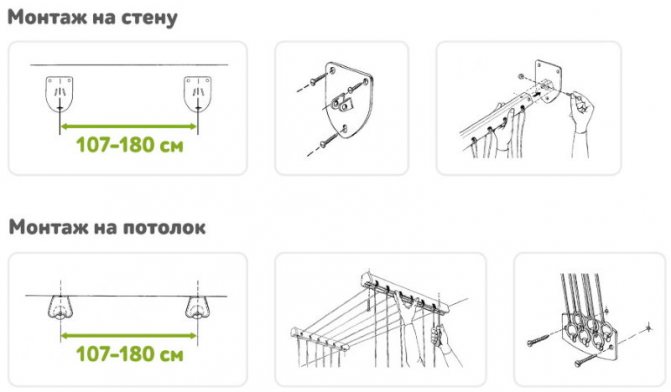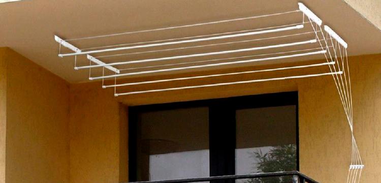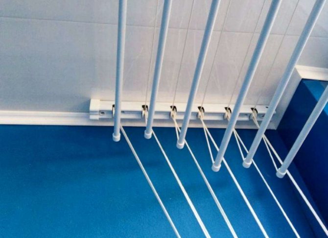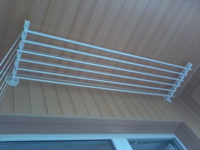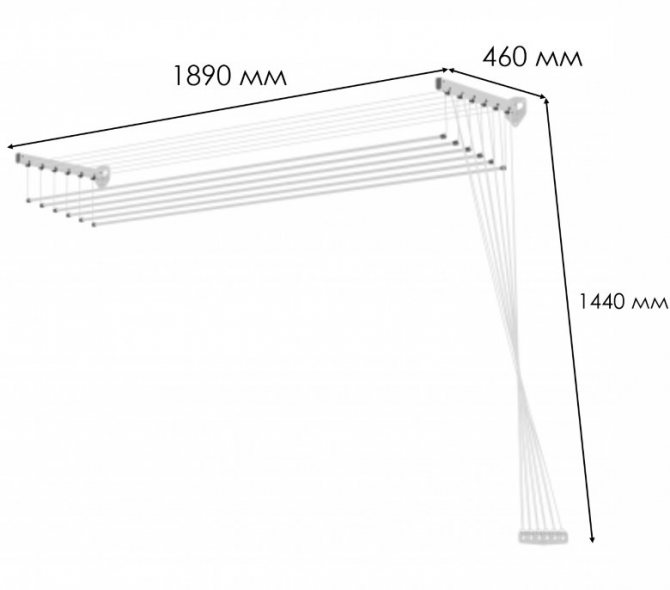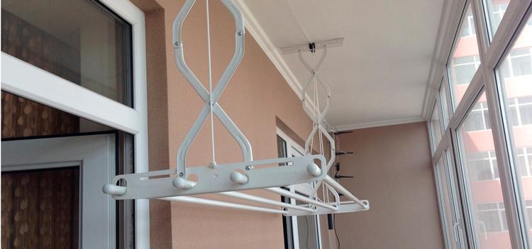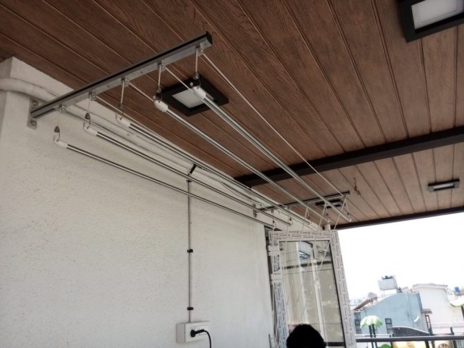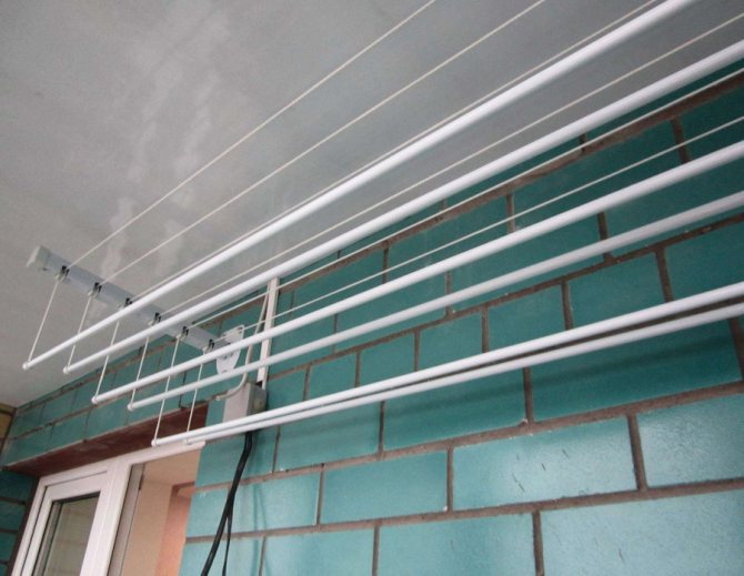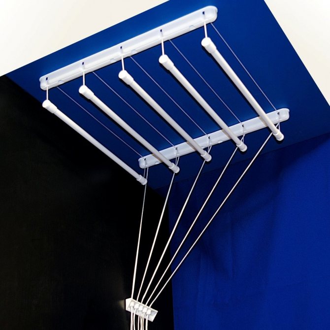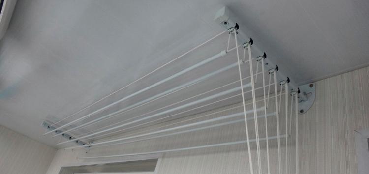 Important. L'installation du séchoir au plafond est effectuée uniquement sur la base solide de la dalle. S'il y a un plafond tendu ou suspendu sur la loggia, il est préférable de choisir un modèle mural ou au sol d'un cintre pour sécher les vêtements.