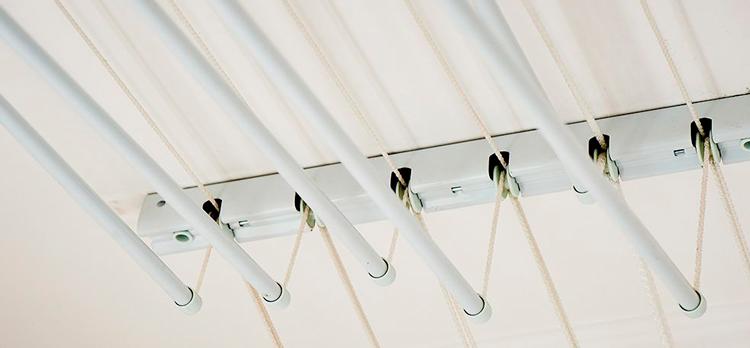 Les «vignes» de bloc ou de plafond se composent généralement de 4 ou 5 poutres métalliques. Leur particularité est que les barres sont fixées ensemble, elles ne peuvent pas être abaissées une à une. Par conséquent, la conception ne nécessite pas un grand nombre de cordons de commande.