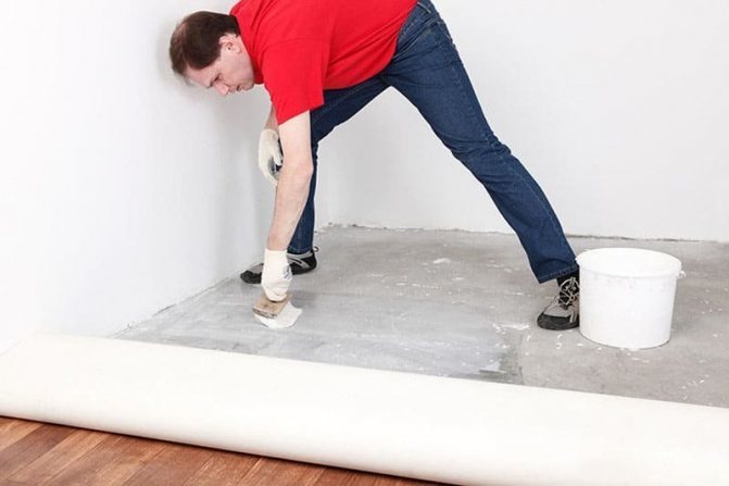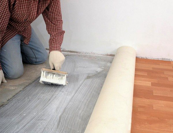 Le substrat doit être collé au sol, sinon il est impossible de coller le linoléum lui-même. La fixation s'effectue à l'aide d'une colle spéciale sur une base résineuse, polyuréthane ou ruban (selon le type de support)
