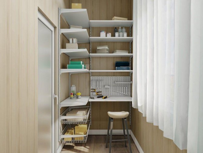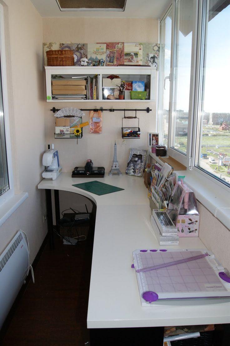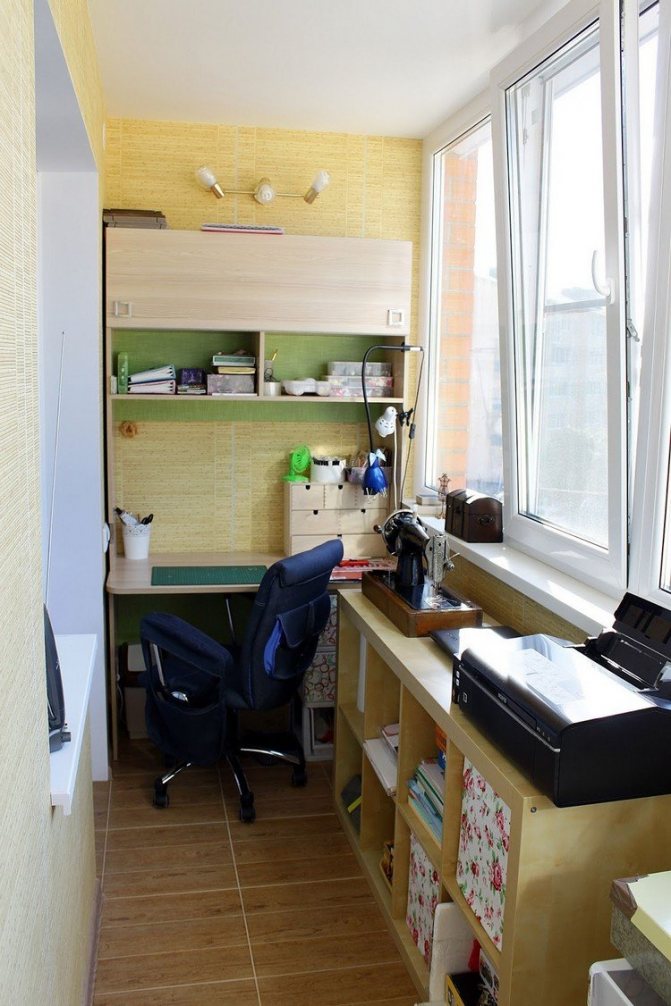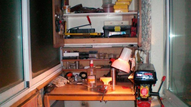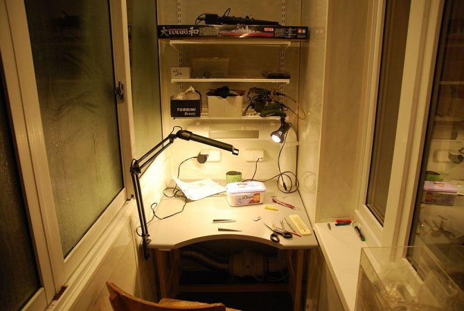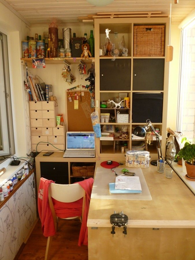 Une question importante qui doit être partiellement réfléchie, même au stade de la planification des travaux de construction. Une caisse est installée sous les meubles articulés et les étagères. L'établi du balcon est monté sur une surface de plancher pré-renforcée. Il existe de nombreuses options pour aménager un lieu de travail confortable et pratique, il suffit de regarder les photos de projets réussis.