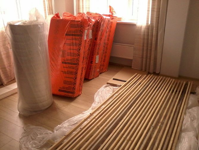 - Faites la caisse de sol à partir de blocs de bois. La section des barres doit être d'au moins 60 mm. La fréquence de pose de la bûche dépend du matériau d'isolation thermique utilisé, mais ne doit pas dépasser 50 à 60 centimètres. Cela fournira un soutien suffisant pour supporter le poids du mobilier et d'autres activités physiques.