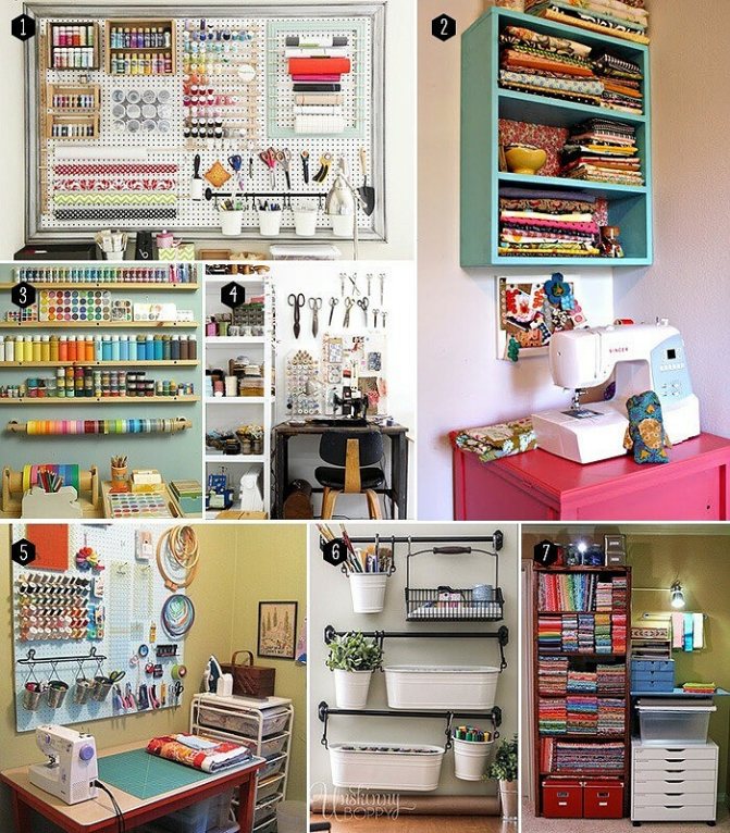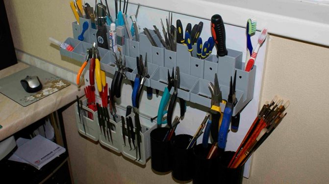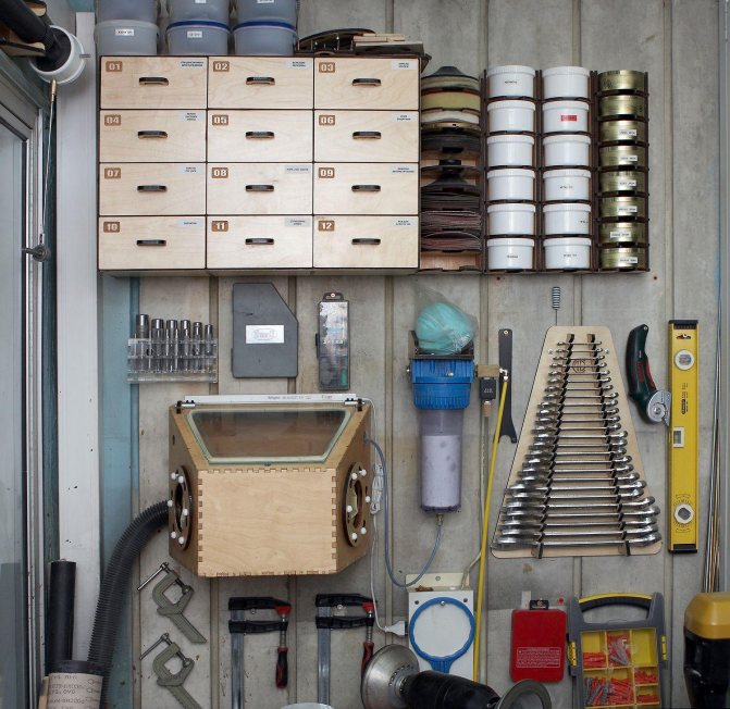 - Pour le stockage de petits outils et matériaux, il est conseillé d'utiliser des systèmes compacts. Ceux-ci peuvent être des étagères suspendues et des crochets, des conteneurs verrouillables et des organisateurs. Pour une petite pièce, la question de l'utilisation rationnelle de l'espace est très pertinente, par conséquent, toutes les boîtes et canettes doivent être étiquetées et disposées selon un système pratique et compréhensible pour le maître.