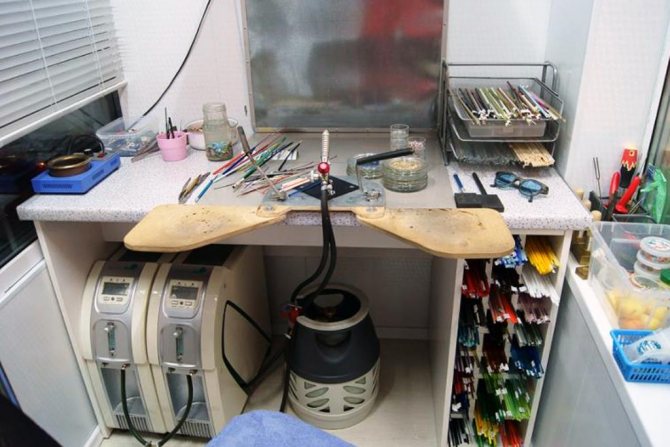 Les premières années, mon atelier était en cuisine. C'était juste un coin avec une table et une hotte. Cependant, lorsque des «idées créatives» ont commencé à vivre dans d'autres parties de la cuisine et que la table a dû être débarrassée des perles et du verre tous les jours pour que la famille puisse dîner, le conseil de famille a décidé d'allouer de l'argent pour moi et de construire un atelier sur le balcon.