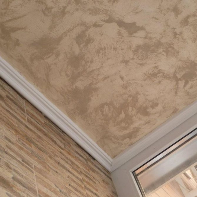 Pour ceux qui ne souhaitent pas isoler le plafond, l'option peinture est idéale. Pour fabriquer un tel plafond, vous avez besoin exactement de peinture de façade.Elle n'a pas peur des changements de température auxquels sont soumises toutes les loggias non isolées. Et le choix des couleurs est assez large et vous pouvez facilement choisir l'option la plus appropriée. De plus, au fil du temps, le plafond peut être teinté.