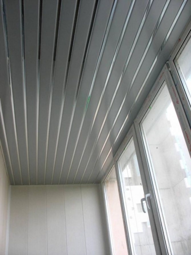 Si la réparation de la loggia a lieu par temps défavorable, l'option avec des lattes métalliques sera idéale. Bien qu'il puisse être utilisé même avec des balcons isolés, ce type de finition est très impressionnant. De plus, vous pouvez créer un plafond de n'importe quelle forme et style à partir d'eux.
