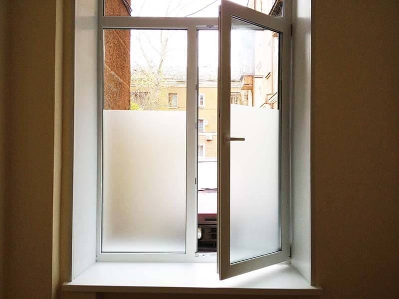 Dans ce cas, il vaut la peine d'installer un film mat avec l'effet du verre sablé. Cela n'assombrira pas la pièce, ne laissera pas passer la lumière, comme du verre ordinaire, mais en même temps, la visibilité sur la zone voisine sera floue et impénétrable.