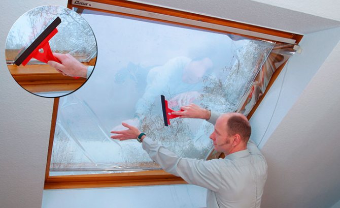 La solution préparée est pulvérisée avec un pistolet pulvérisateur sur toute la surface de la fenêtre. L'excès d'humidité doit être éliminé avec une spatule en caoutchouc. Le morceau de film préparé est retiré de la base. La partie retirée peut être pliée, froissée. Pour éviter les plis, pliez, retirez avec un assistant.