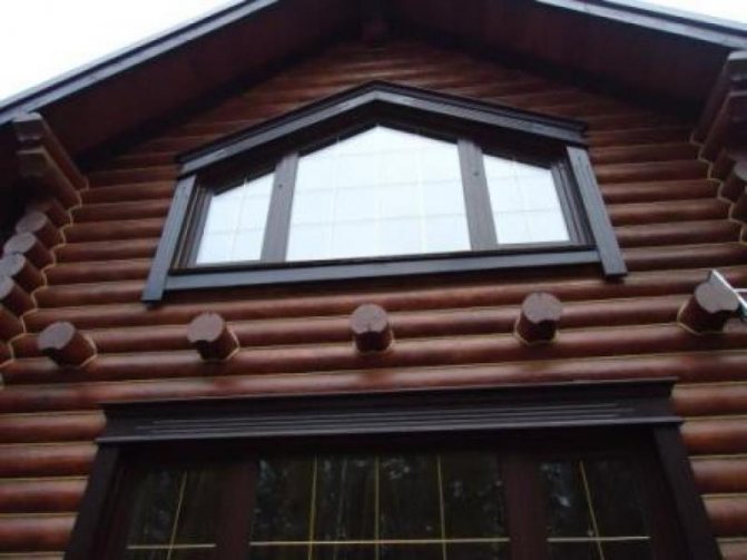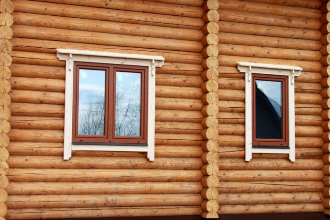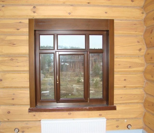Vous pouvez trouver des fenêtres dans les maisons en bois qui ont des cadres en plastique. Ce matériau est pratique et pratique, à la fois en fonctionnement et en fabrication. Les plateaux en plastique peuvent avoir n'importe quelle forme et couleur, leur couleur peut même imiter le bois naturel.