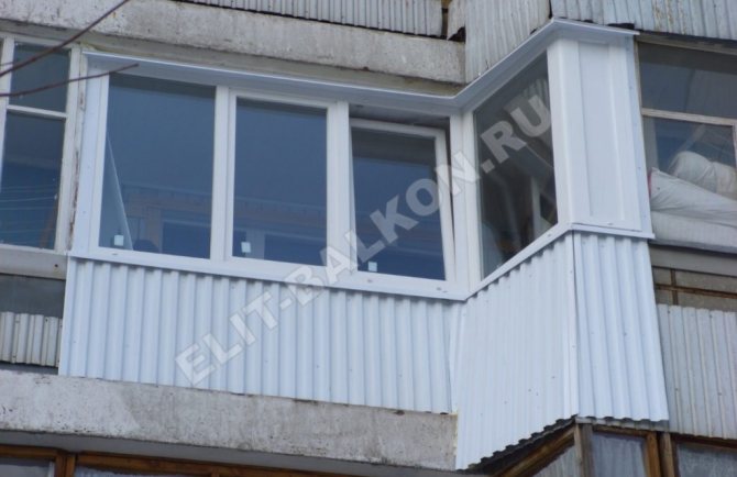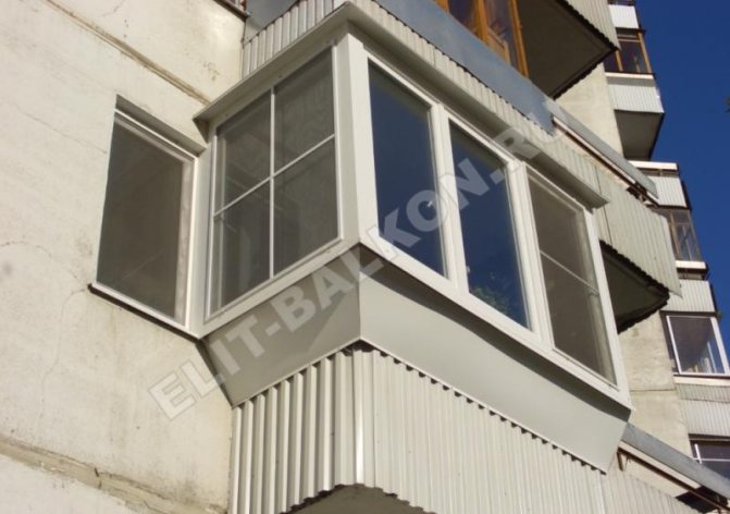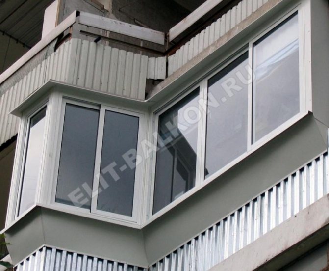 - Lattage avec sorties obliques sur les côtés, ainsi que sur la partie avant, vous permettant d'agrandir la surface du balcon grâce aux appuis de fenêtre. Avec cette version de la base, le revêtement de balcon avec une feuille profilée doit être réalisé avec une assurance. Cela est dû à la configuration plus complexe de la structure. Et toutes les complications entraînent une certaine inaccessibilité des endroits où il est nécessaire de fixer la feuille professionnelle. De tels travaux ne peuvent être effectués seuls, car ils comportent un risque pour la santé des constructeurs.