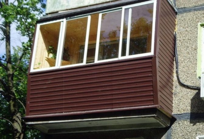 Pour de tels travaux, dans la plupart des cas, un revêtement est utilisé, tout le revêtement en plastique ou en bois populaire, ainsi que des tôles profilées en métal peint. L'un des plus fiables, solides et bon marché est le revêtement du balcon spécifiquement avec une feuille profilée.