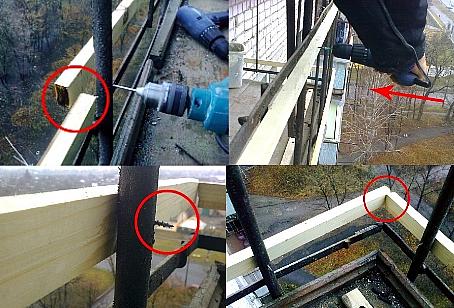 Le lattage est fixé à la partie métallique de la structure du balcon, pour cela un certain nombre de trous y sont percés. Dans chaque tige et crémaillère, deux trous sont percés avec un pas de 1 m. Le diamètre de chaque trou individuel ne doit pas dépasser 4 mm, sinon la structure peut s'affaiblir. Les lattes du lattage ne sont pas fixées avec des vis, mais avec des vis autotaraudeuses.