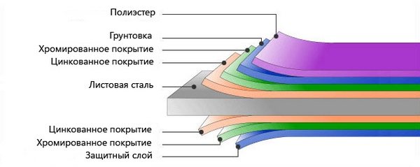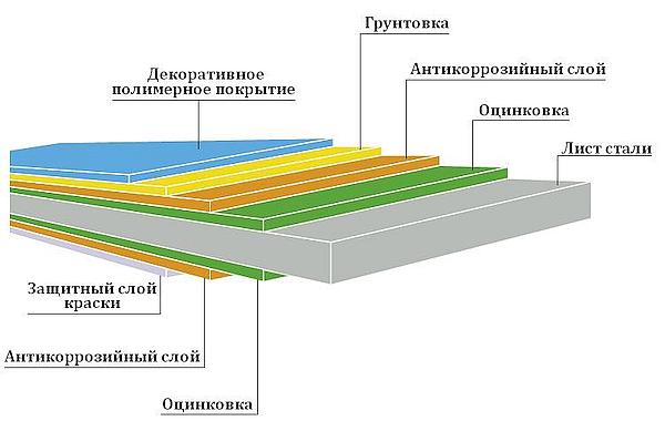 Le platelage est une tôle d'acier de haute qualité revêtue d'une couche anticorrosion de zinc chaud et d'un polymère coloré à des fins décoratives. La couche de polymère est en plastisol ou en polyester. Tôle ondulée ondulée, les ondulations servent ici de raidisseurs. C'est grâce aux ondulations que le matériau acquiert des propriétés de portance et la capacité de résister à des charges accrues.