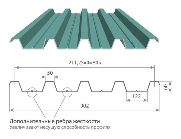 Il s'agit d'une fine tôle ondulée galvanisée (0,38-1,2 mm). Les ondulations sont trapézoïdales. Leur hauteur dépend du fabricant, mais selon les normes - au moins 20 mm.