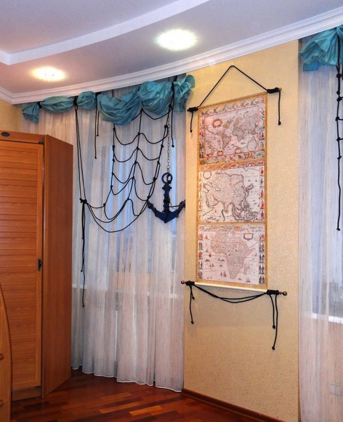 - Le thème marin se joue à l'aide de textiles unis ou de toiles à rayures bicolores. L'atmosphère sera complétée par les cordes qui entourent chaque rideau. Une autre option consiste à accrocher un rideau en filet.