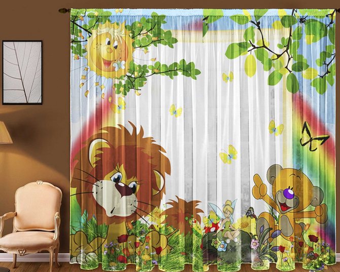 - L'impression de photos sur des toiles aidera à décorer les rideaux dans le style d'un conte de fées. Des personnages de dessins animés y sont placés.