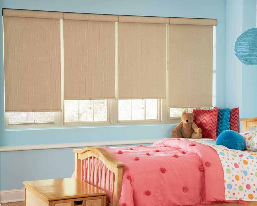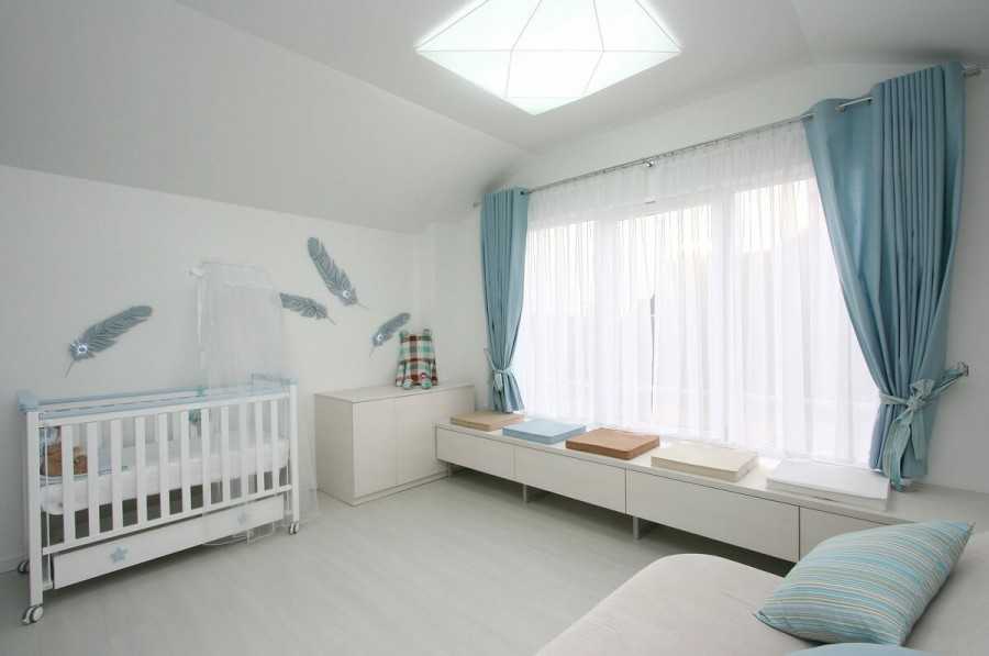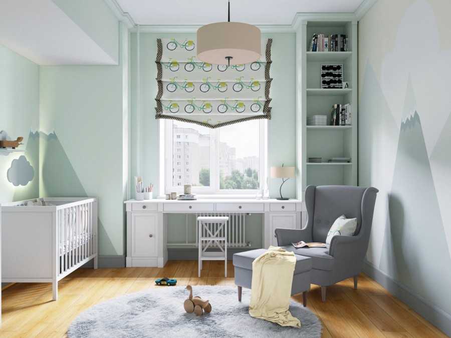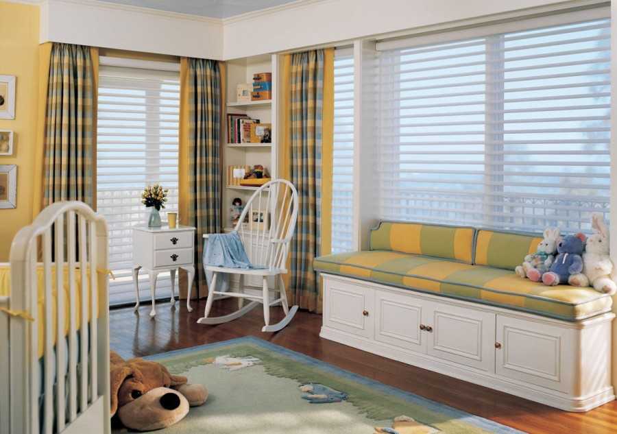 Le bébé passe beaucoup de temps dans sa chambre. C'est ici que se déroulent ses premiers cours et jeux. Dans ce cas, l'éclairage doit être complet. Dans le même temps, l'enfant a encore besoin d'une journée de sommeil et une lumière vive peut interférer avec le repos de l'enfant. Vous pouvez utiliser la version classique avec des rideaux solides, mais cette option ne convient pas toujours. Il est beaucoup plus pratique d'utiliser des stores horizontaux et des voilages légers.