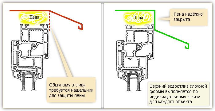- Ensuite, les marées descendantes supérieure et inférieure sont installées. Leur tâche est de protéger de manière fiable la fenêtre des précipitations. La fixation est réalisée à l'aide de vis autotaraudeuses.