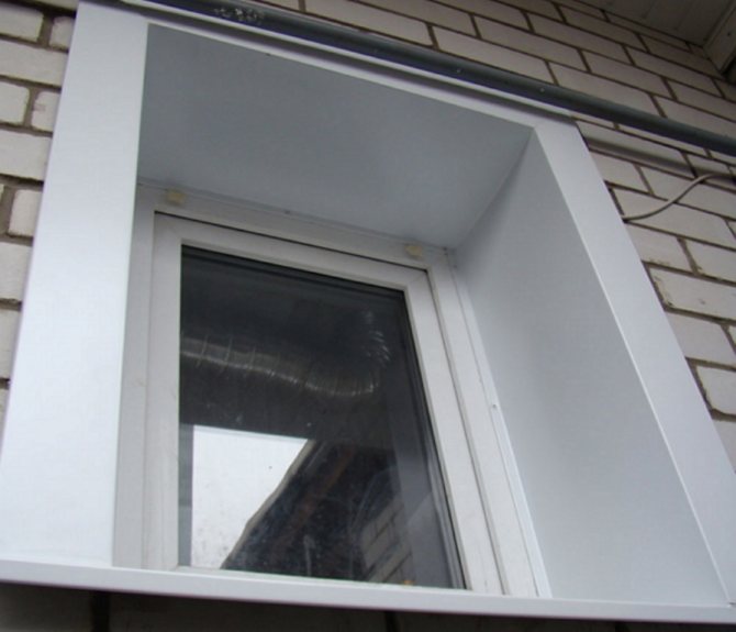 Tout d'abord, la bande initiale est fixée à la fenêtre sur tout le périmètre, puis le reflux inférieur, les pentes supérieure et latérale y sont insérées à leur tour, qui sont coupées les unes dans les autres et fixées avec des vis sur la peau du bâtiment.
